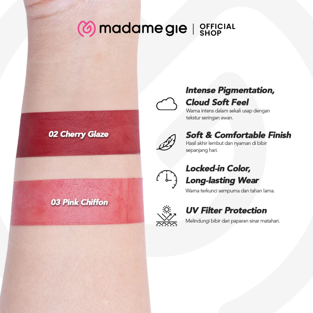 • Tekstur ringan seperti air yang menjaga bibir tetap lembap dan nyaman.